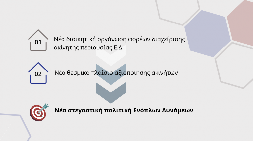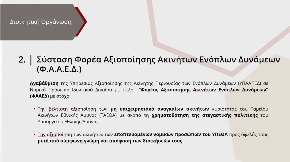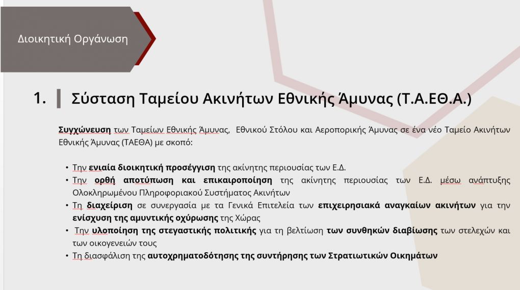 Το πρώτο κατατείνει στην αποτελεσματικότερη και ορθολογικότερη διαχείριση της ακίνητης περιουσίας των Ενόπλων Δυνάμεων, μέσω της σύστασης ενός ενιαίου ταμείου διαχείρισής της, του Ταμείου Ακινήτων Εθνικής Άμυνας (Τ.Α.Ε.θ.Α), το οποίο θα συγχωνεύει τα προϋφιστάμενα ταμεία των τριών κλάδων και θα ενσωματώνει τους σκοπούς τους, με αποστολή την κάλυψη αναγκών εθνικής άμυνας και την υλοποίηση δράσεων για την κάλυψη των στεγαστικών αναγκών των στελεχών των Ενόπλων Δυνάμεων.