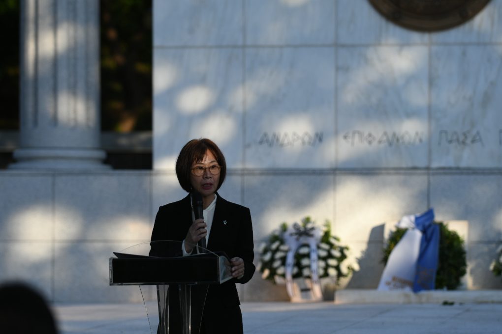 Κυρίες και κύριοι, η απόσταση που χωρίζει την Ελληνική Δημοκρατία και τη Δημοκρατία της Κορέας είναι μεγαλύτερη από 8.500 χιλιόμετρα. Ωστόσο, τις ενώνει η προσήλωση στις κοινές αρχές που τις οδήγησαν στη σωστή πλευρά της Ιστορίας περισσότερα από 70 χρόνια πριν. Επιτρέψτε μου να αναφέρω ορισμένες εξ αυτών: Πατριωτισμός, δικαιοσύνη, δημοκρατία, κράτος δικαίου και ειρηνική επίλυση των διαφορών. Αυτό το μνημείο, που αναγέρθηκε από τους Κορεάτες φίλους μας, στέκεται ως απόδειξη όχι μόνο των θυσιών που έκαναν οι Έλληνες στρατιώτες σε αυτό τον τόπο, αλλά και της διαχρονικής πίστης των εθνών μας σε κοινά ιδανικά. Σε αυτή την εποχή της παγκόσμιας αβεβαιότητας και της επανεμφάνισης των αναθεωρητικών πολιτικών, είναι σημαντικό να συνεχίσουμε να αναλογιζόμαστε αυτές τις αξίες, ενώ οικοδομούμε μαζί ένα καλύτερο μέλλον.