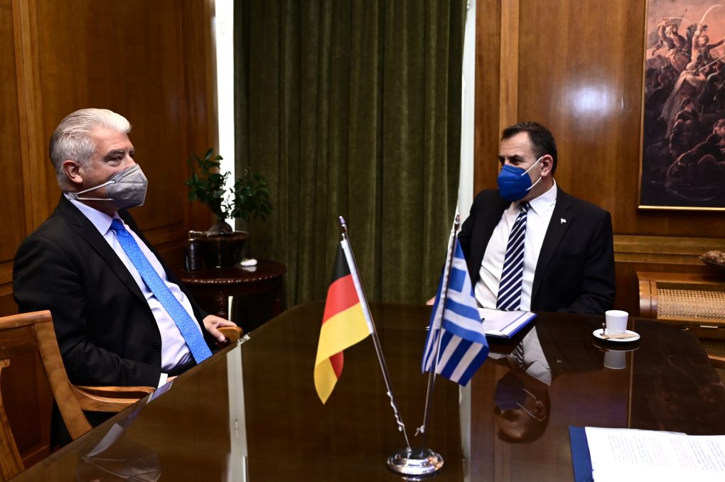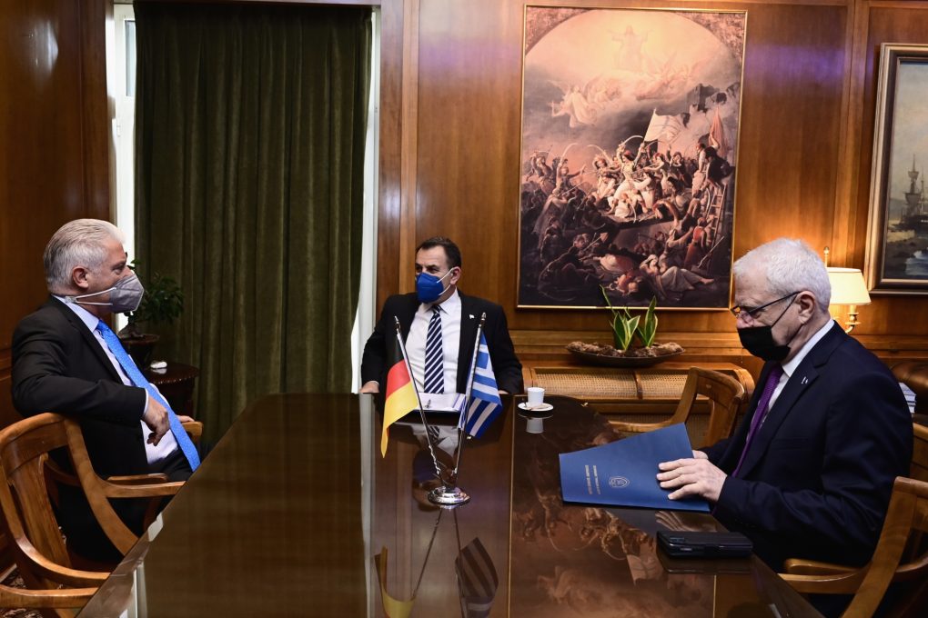 O Υπουργός Εθνικής Αμύνης κ. Νικόλαος Παναγιωτόπουλος είχε σήμερα Πέμπτη 31 Μαρτίου 2022, συνάντηση με τον Πρέσβη της Γερμανίας κ. Έρνστ Ράιχελ΄(Ernst Reichel), με τον οποίο συζήτησαν θέματα διμερούς αμυντικής συνεργασίας, καθώς και, αμοιβαίως επωφελούς, συνεργασίας στον τομέα της αμυντικής βιομηχανίας.