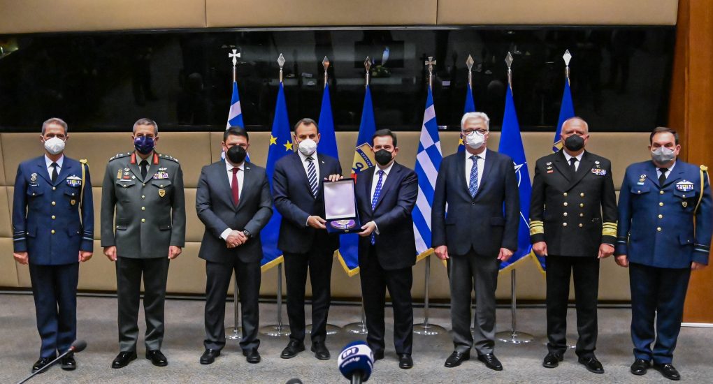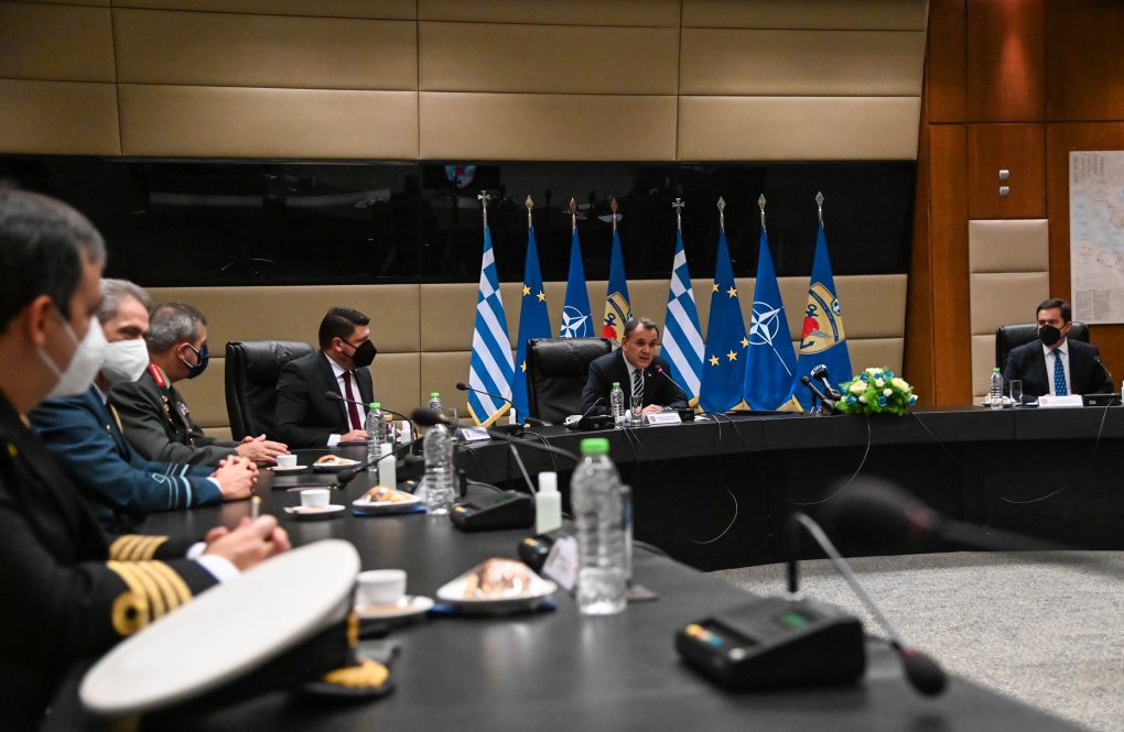 Με χαρά μας υποδεχόμαστε σήμερα στο Υπουργείο Εθνικής Άμυνας τον καλό φίλο και εξαιρετικό συνάδελφο τον κύριο Νότη Μηταράκη, Υπουργό Μετανάστευσης, προκειμένου να σηματοδοτήσουμε, μια ιδιαίτερη καμπή στη διαχείριση του Μεταναστευτικού στην Πατρίδα μας. Επισήμως λοιπόν, σήμερα και δυνάμει του Νόμου που έχει ψηφιστεί από το Ελληνικό Κράτος, από 31 Δεκεμβρίου 2021 οι Ένοπλες Δυνάμεις απεμπλάκησαν από τη διαχείριση των ζητημάτων που απορρέουν από τις προσφυγικές και μεταναστευτικές ροές.