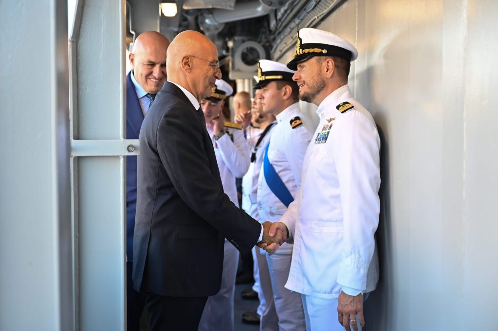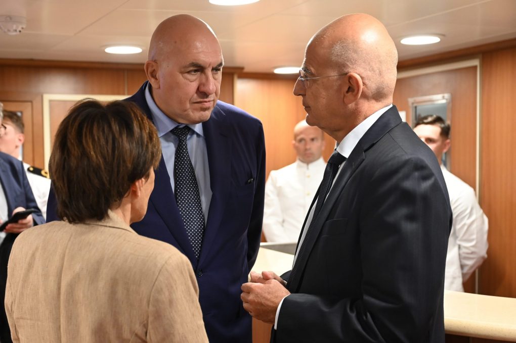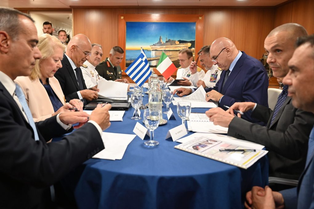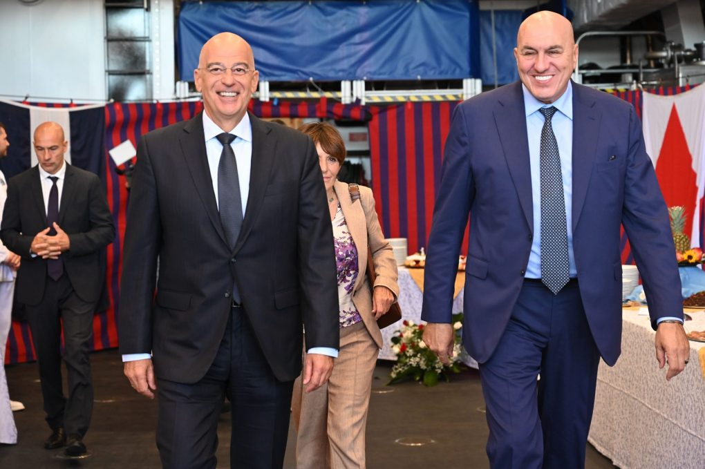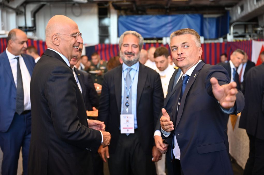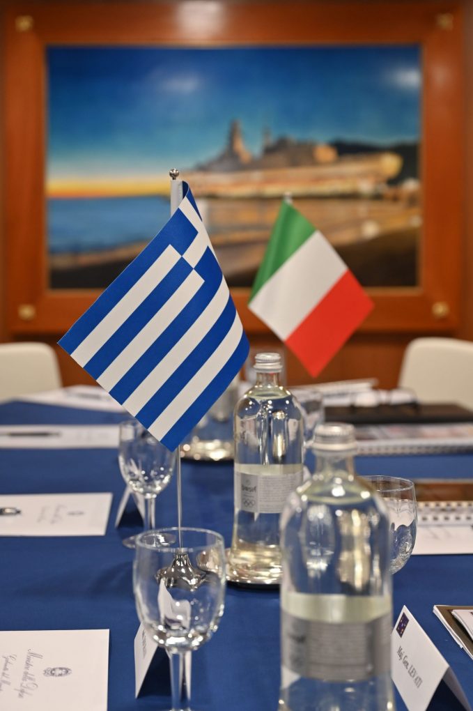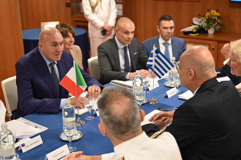 Ο κ. Δένδιας, συνοδευόμενος από τον Αρχηγό ΓΕΝ Αντιναύαρχο Δημήτριο-Ελευθέριο Κατάρα ΠΝ, συναντήθηκε με τον Υπουργό Άμυνας της Ιταλίας Γκουΐντο Κροσέτο (Guido Crosetto) στη Φρεγάτα του Πολεμικού Ναυτικού της Ιταλίας F 598 ITS.